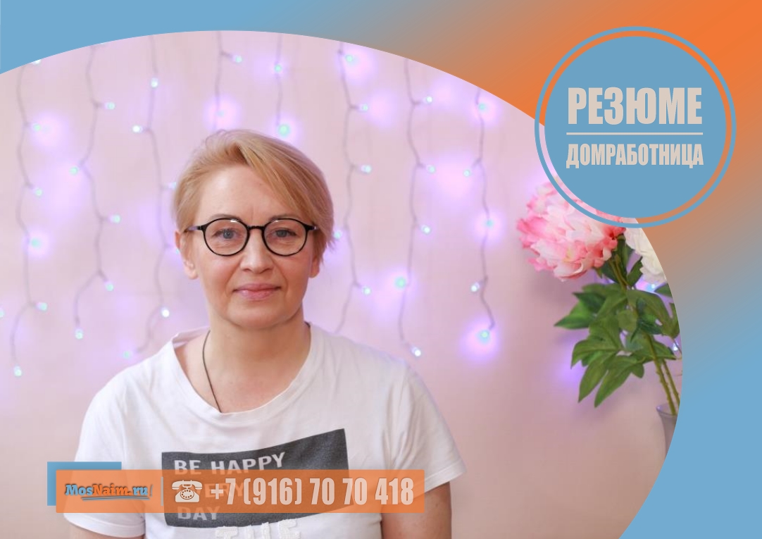 Имеет опыт работы: домработница с функциями няни (квартира 100 кв. м., мальчик 3 года, девочка 7 лет) – 1 год; домработница с функциями няни (квартира 100 кв. м., дом 300 кв. м., мальчики 12 лет и 3 года, девочки 5 лет и 4 года) – 1 год; домработница с функциями няни (квартира 90 кв. м., мальчики 3 года и 10 лет) – 1 год.
