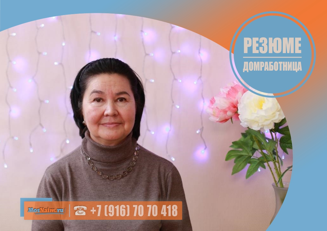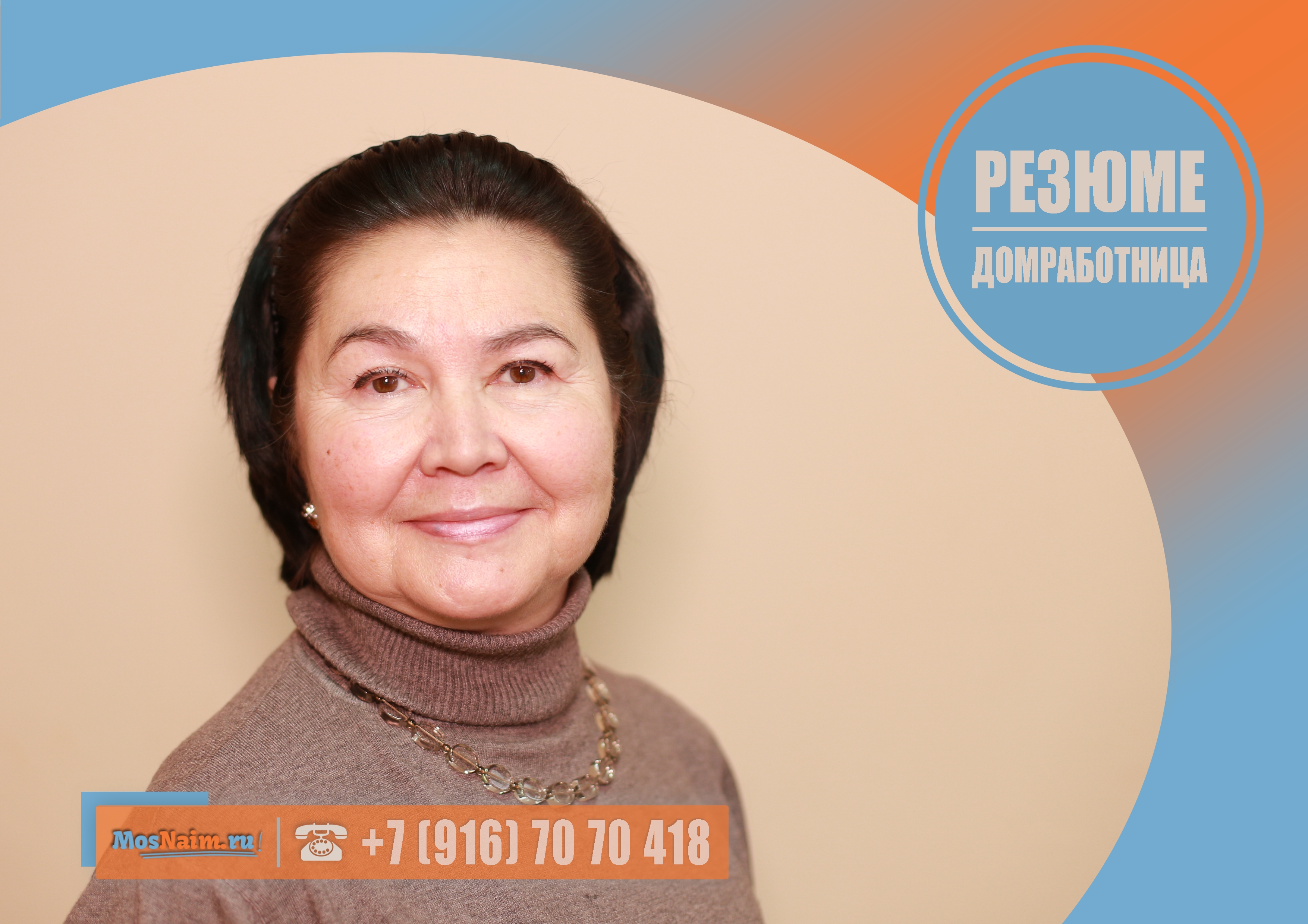 Имеет опыт работы: няня, домработница (девочка 5 лет) – 1 год; няня у двоих детей (мальчики 13 лет и 1 год) – 1 год; домработница (квартира 200 кв. м.) – 5 лет. Готова предоставить рекомендации.