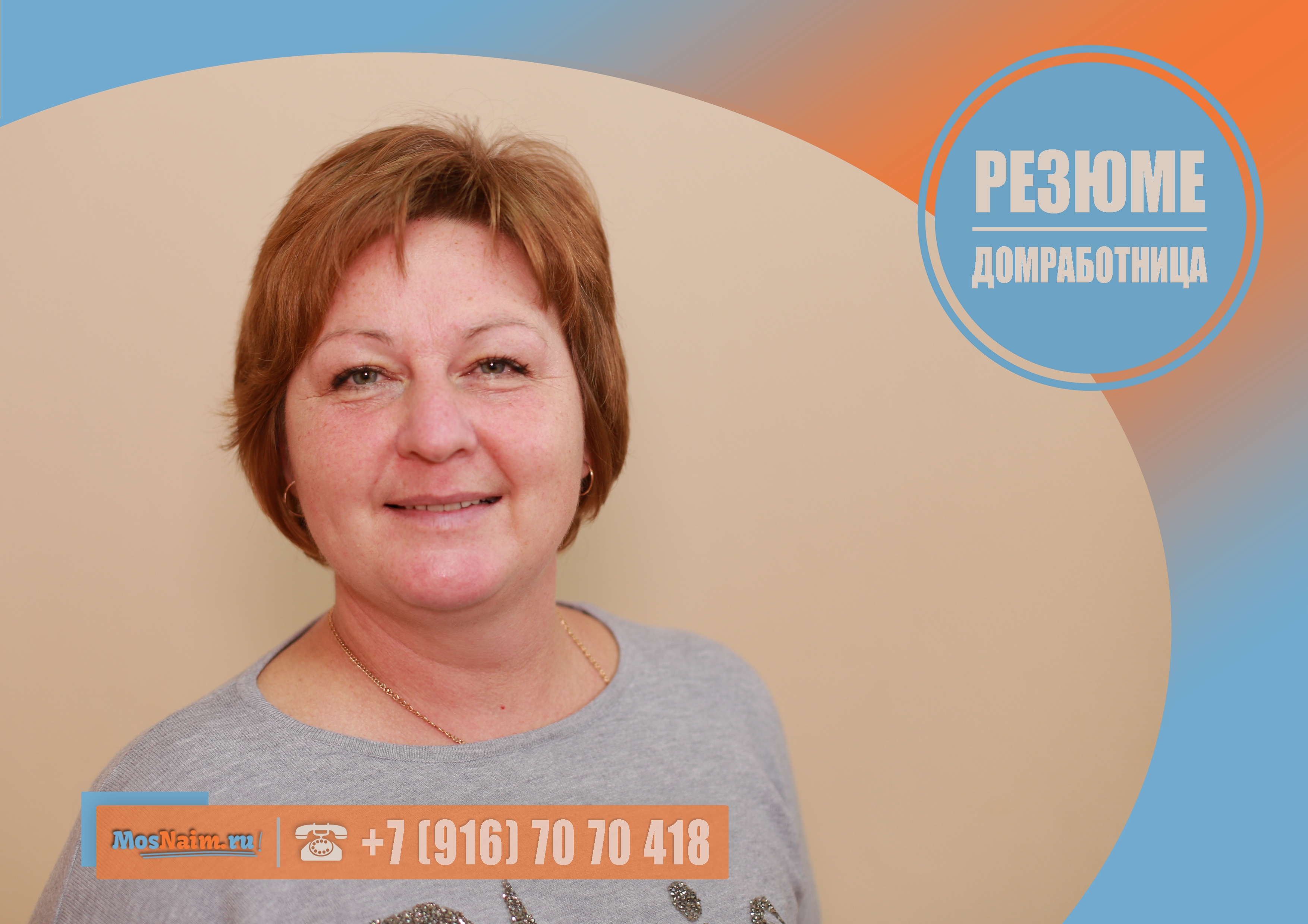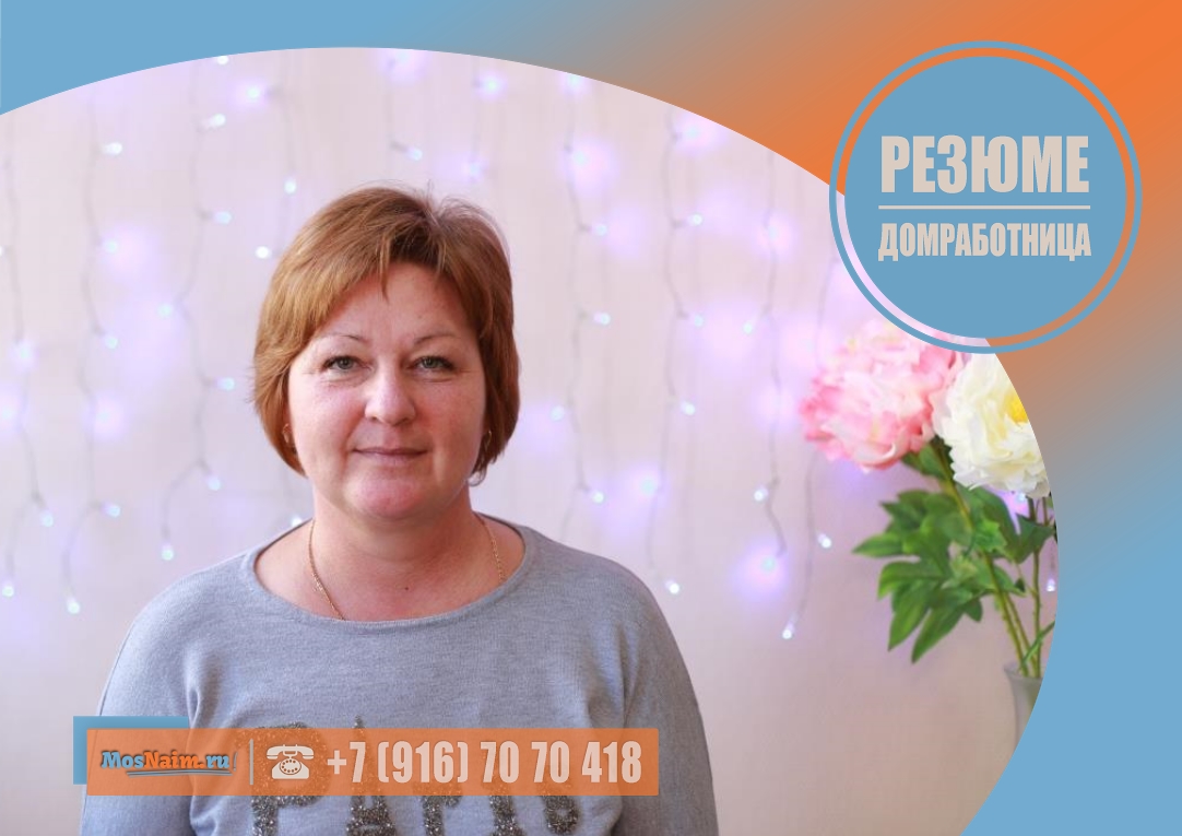 Имеет опыт работы: домработница (дом 300 кв. м.) – 3 года. Готова предоставить рекомендацию.