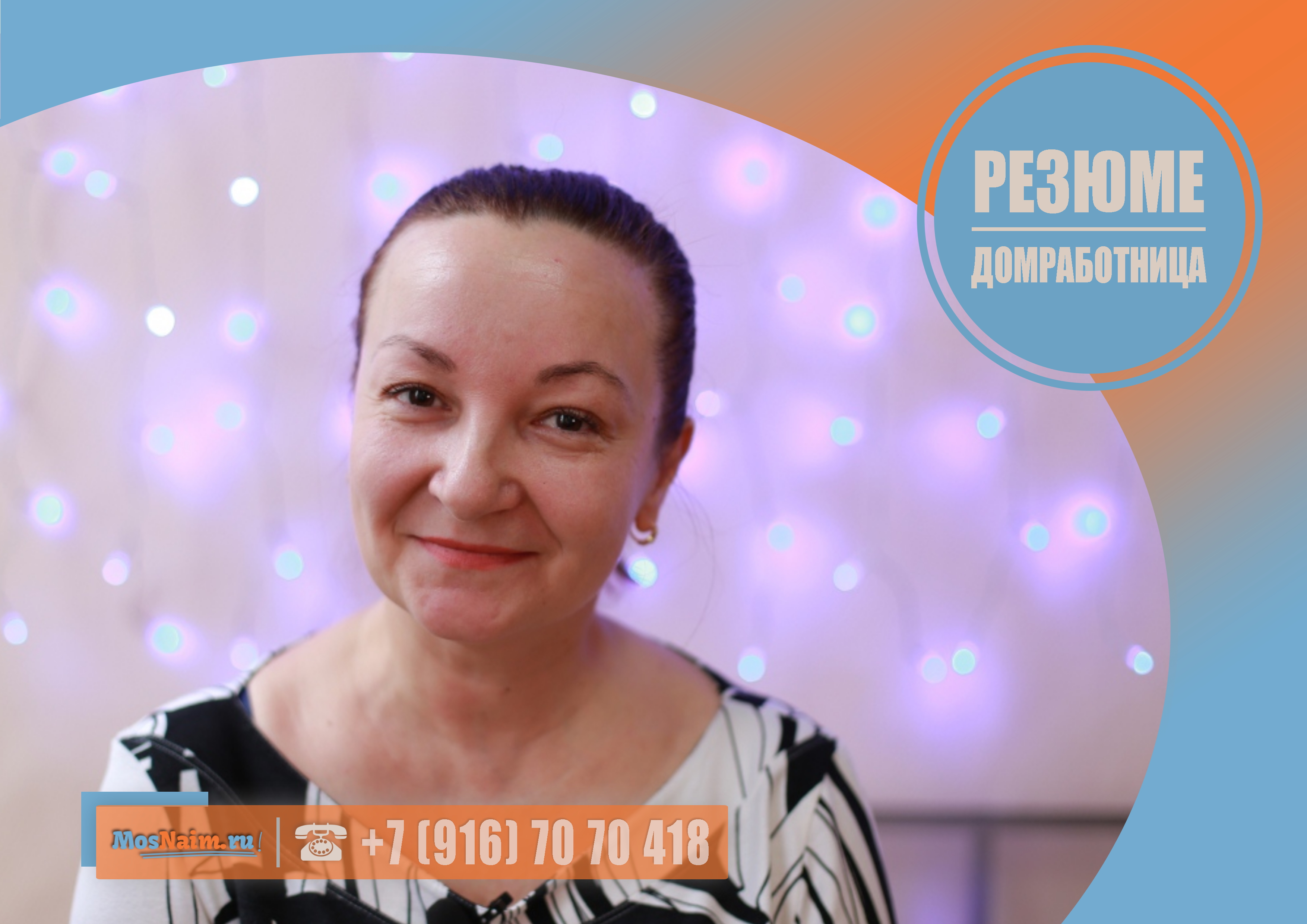 О кандидате: 49 лет, без семейных проблем, мама одного ребёнка, знак зодиака — рак, национальность — украинка, вероисповедание — православие, без вредных привычек, в наличии загранпаспорт (действителен до 12.11.2023 г.), в наличии патент (действителен до 29.05.2020 г.), получила среднее специальное образование по специальности «Дошкольное воспитание», готова работать под камерами видеонаблюдения, согласна пройти проверку на полиграфе, непогашенных кредитов нет.