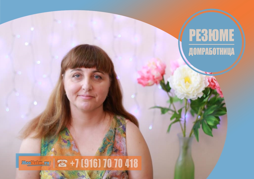 Имеет опыт работы: домработница (квартира 200 кв. м.) – 1 год 4 месяца; домработница (дом 400 кв. м.) – с апреля 2017 года по настоящее время. Готова предоставить рекомендацию