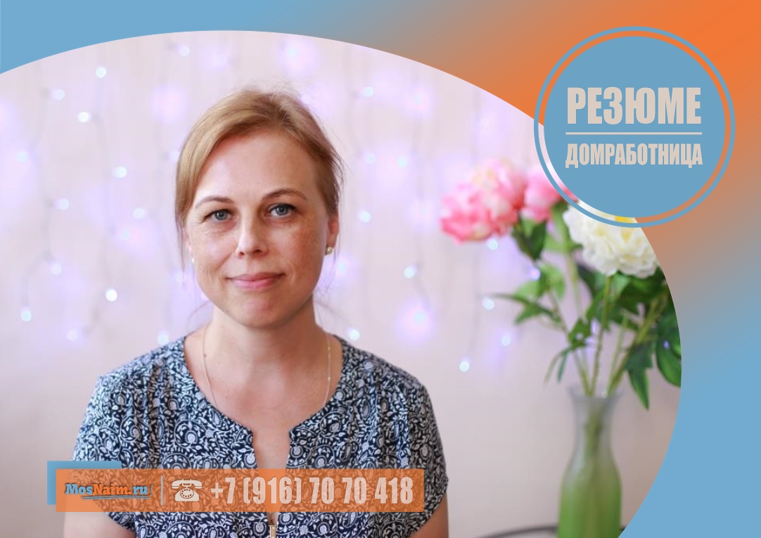 Имеет опыт работы: домработница (дом 400 кв. м.) – 4 месяца; домработница (дом 700 кв. м.) – 5 месяцев. Готова предоставить рекомендацию.