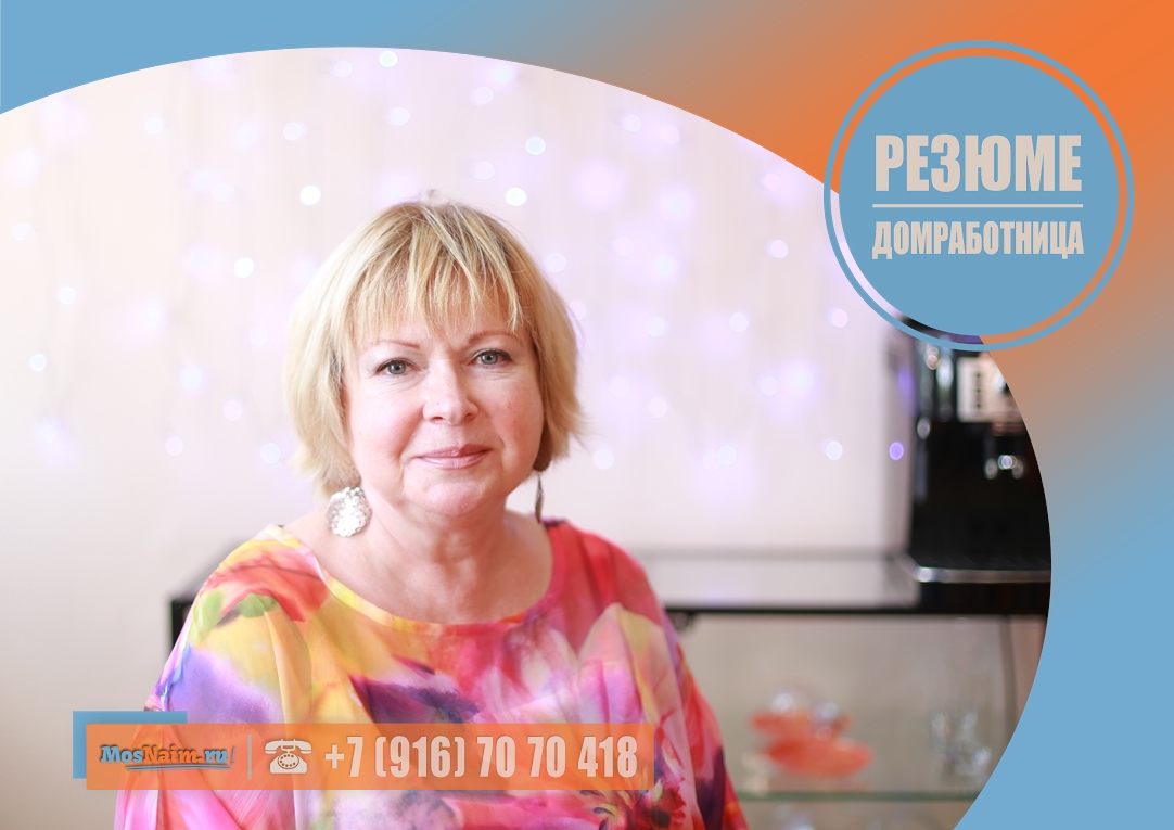 Имеет опыт работы: домработница (трёхкомнатная квартира 300 кв. м.) – 1 год 3 месяца; домработница (трёхкомнатная квартира 250 кв. м.) – 2 года 2 месяца; домработница (четырёхкомнатная квартира 250 кв. м.) – 2 года; приходящая домработница (квартира 250 кв. м., квартира 180 кв. м., квартира 100 кв. м.) – 2 года.