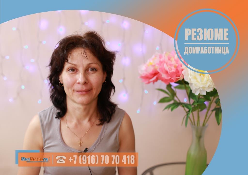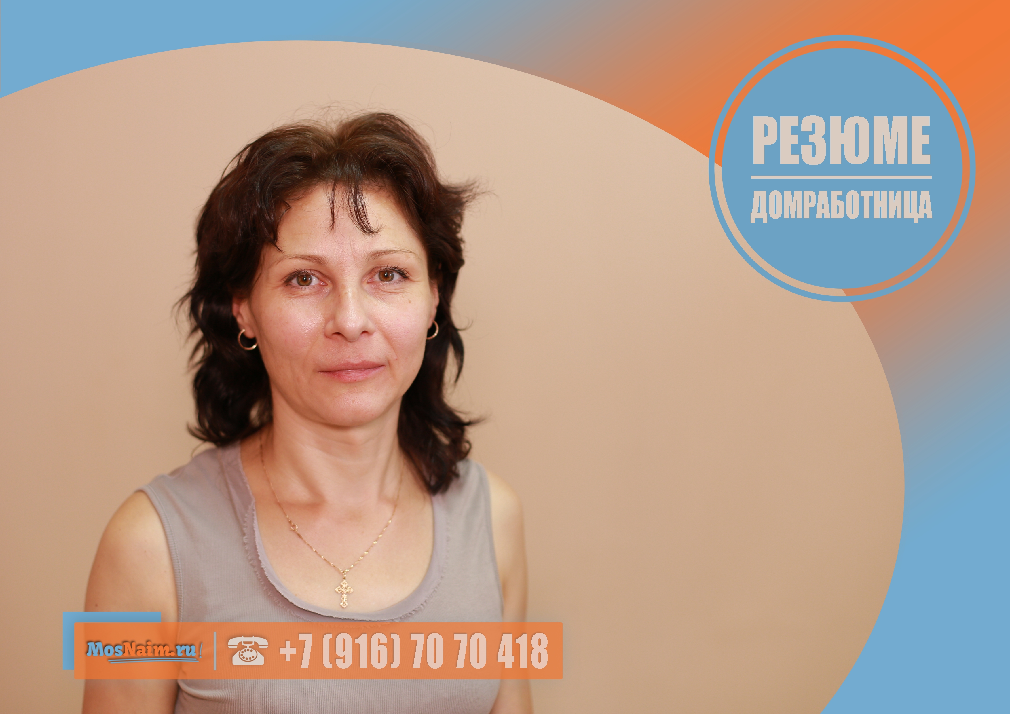 О кандидате: 49 лет, без семейных проблем, мама совершеннолетнего ребёнка, знак зодиака — лев, национальность — русская, вероисповедание — православие, без вредных привычек, в наличии свидетельство о прохождении тренинга для домработниц, горничных, в наличии загранпаспорт (действителен до 10.07.2027 г.), получила среднее специальное образование по специальности «Дежурная по ж/д станции» (со слов соискателя), готова работать под камерами видеонаблюдения, просроченных кредитов нет.