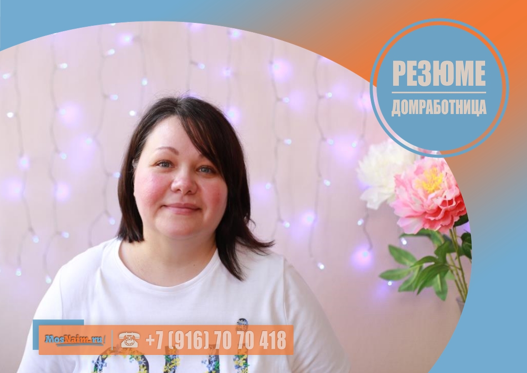 Имеет опыт работы: домработница (две квартиры 100 кв. м. и 300 кв. м.) – 3 года.