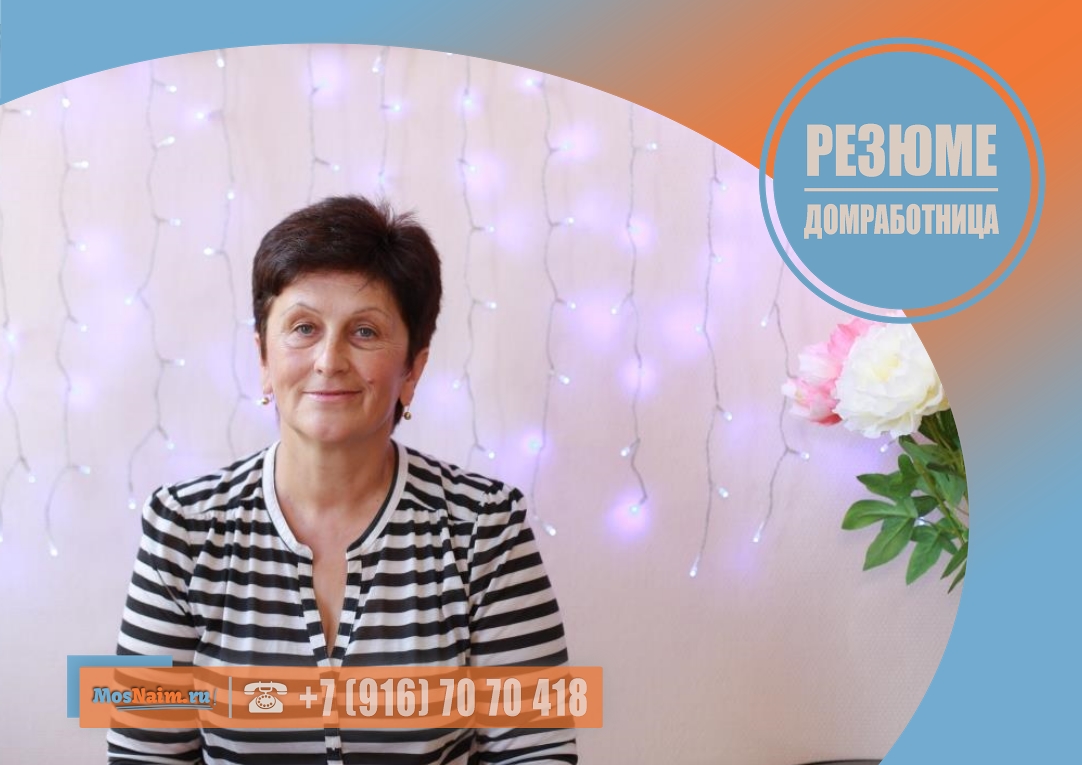 Имеет опыт работы: домработница (квартира 300 кв. м.) – 5 лет. Готова предоставить рекомендацию.