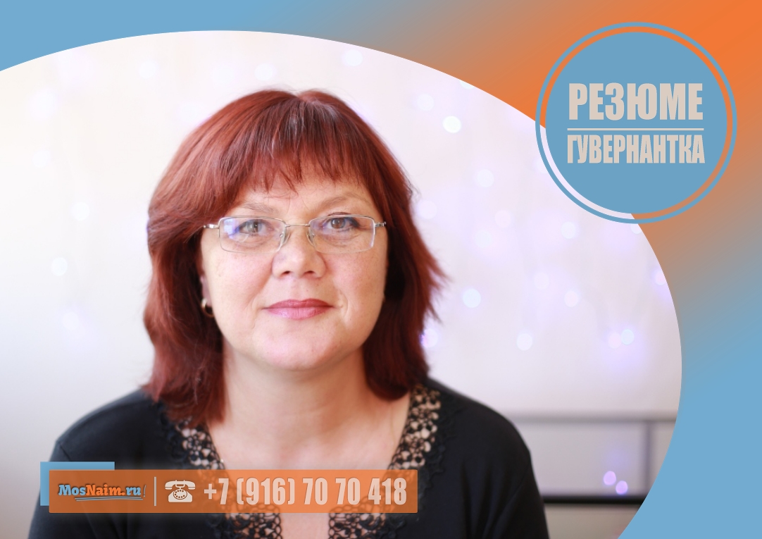 Имеет опыт работы: учитель украинского языка и литературы (параллельно руководитель вокальной студии) – 25 лет; няня (мальчик 4 года) – 3 месяца; гувернантка (мальчик 6 лет, мальчик 8 лет) – 10 месяцев; няня у двоих детей (мальчик 1,3 года и девочка 4,5 года) – 6 месяцев.