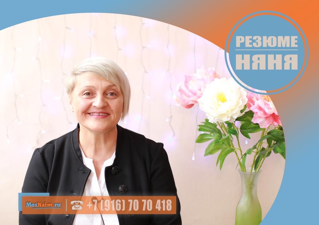 Имеет опыт работы: педагогический стаж (учитель начальных классов) – 25 лет; сиделка (женщина 82 года, диагноз: деменция) – 11 месяцев; няня (мальчик 2 года 6 месяцев) – 3 месяца.