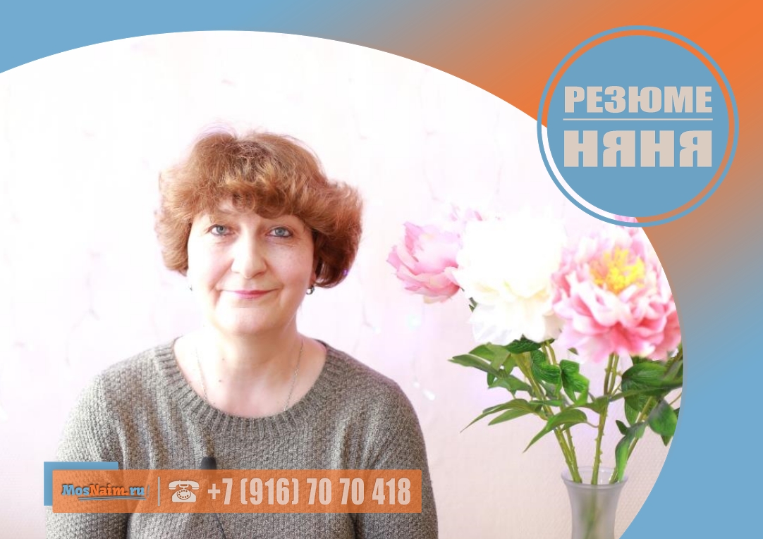 Имеет опыт работы: педагогический стаж (воспитатель в детском саду) – 30 лет; няня (девочка 3 года) – 7 месяцев; няня (мальчик 5 лет) – 2 года; няня (девочка 3 года) – 4 года; няня (девочка 1 год 7 месяцев) – 2 года; няня (девочка 3 года) — 6 месяцев. Готова предоставить рекомендации.