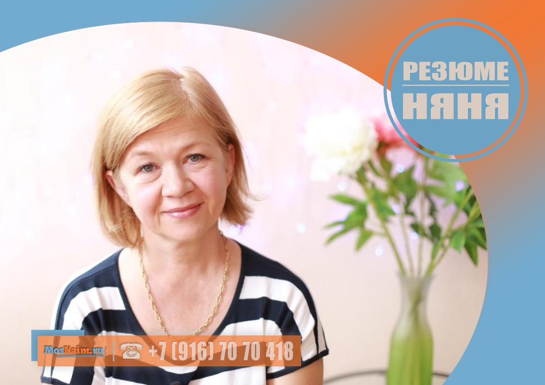 Имеет опыт работы: педагогический стаж (преподаватель иностранного языка) – 15 лет; няня-воспитатель у двоих детей (мальчики 2, 5 года и 5 лет) – 1 год; няня у двоих детей (девочки по 1,5 года и 3 года) – 1 год; гувернантка у близнецов (мальчик и девочка по 3,5 года) – 3 года; гувернантка (девочка 8 лет) – 1 год. Готова предоставить рекомендации.