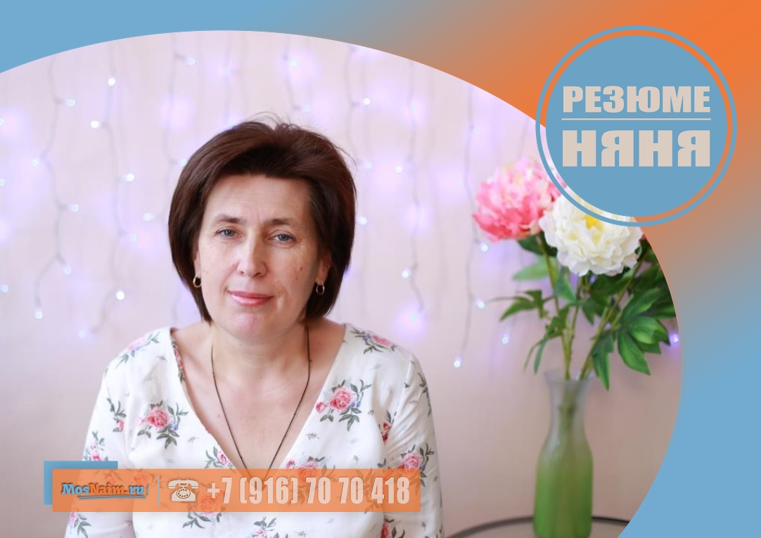 Имеет опыт работы: педагогический стаж (учитель начальных классов) – 25 лет; няня (девочка 4 года) – 2 года; няня (девочка 2 года) – 5 месяцев; няня (мальчик 3 года 8 месяцев) – 11 месяцев.