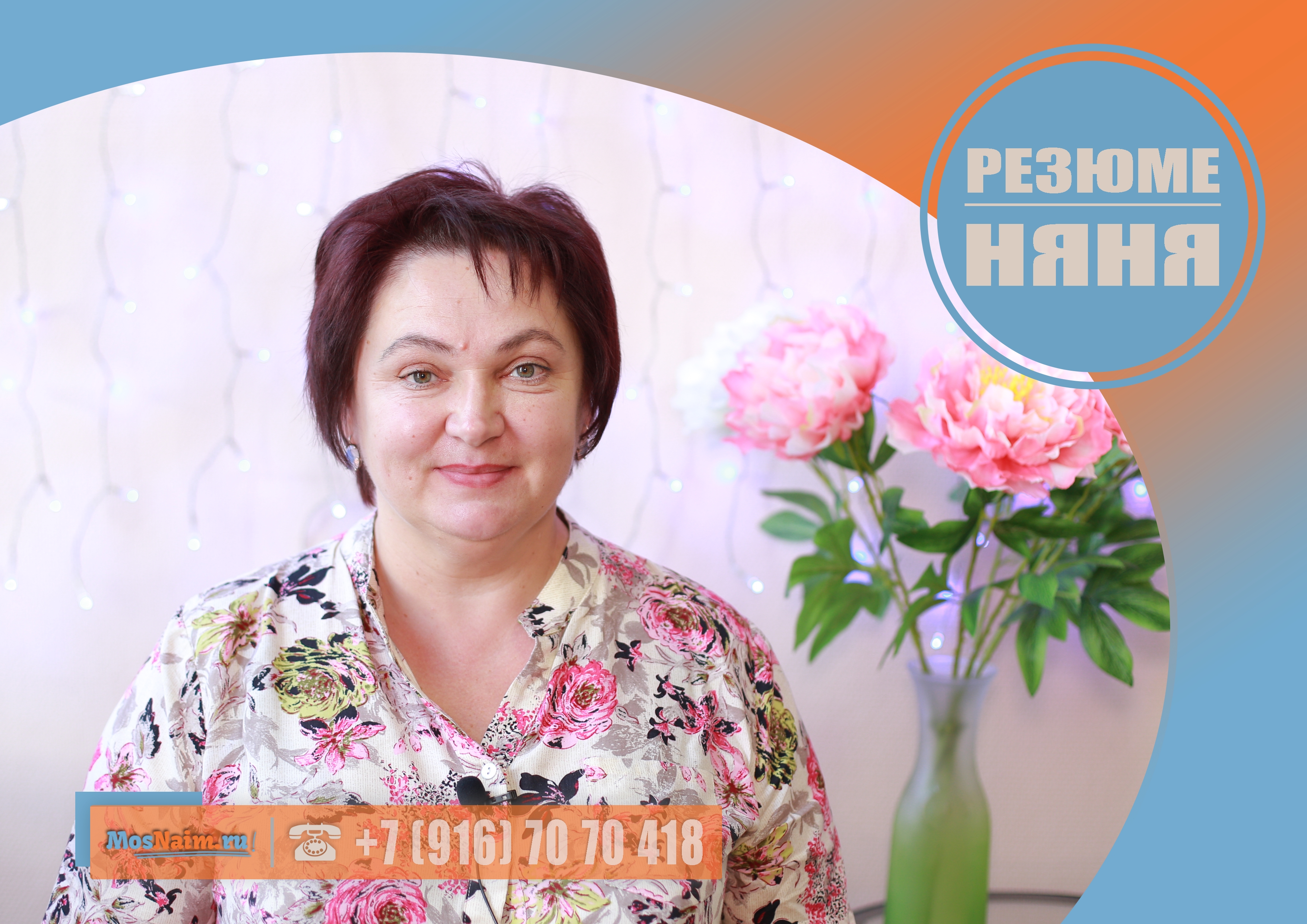 Имеет опыт работы: педагогический стаж (преподаватель) – 20 лет; няня-помощница по хозяйству (мальчик 1 год 2 месяца) – 1 год; няня-гувернантка (девочка 6 лет) – 3 года; няня (мальчик 1 год 6 месяцев) – 8 месяцев. Готова предоставить рекомендации.
