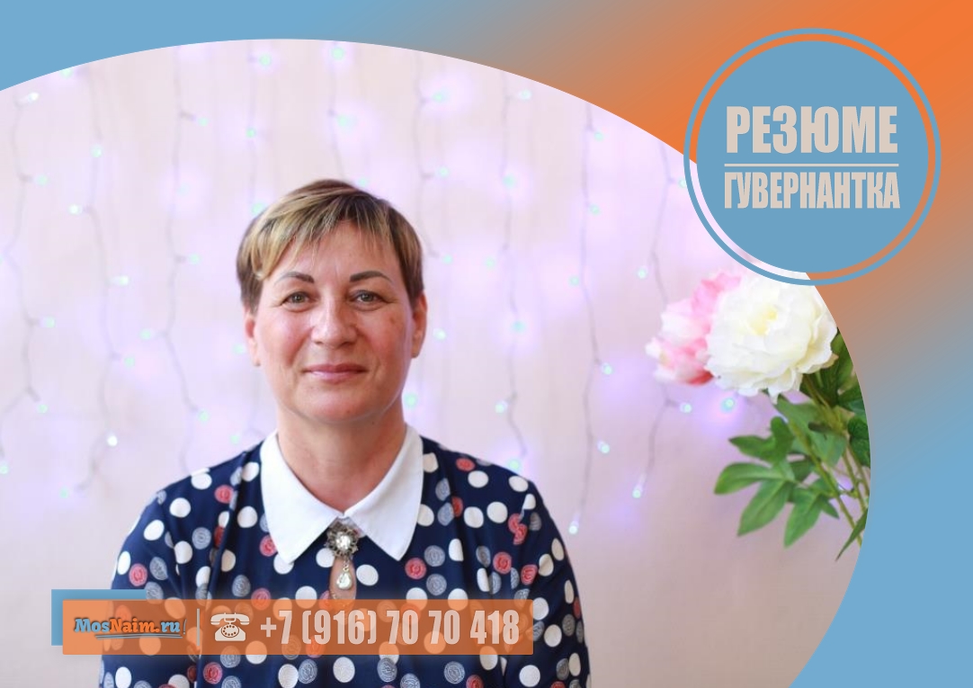 Имеет опыт работы: педагогический стаж (учитель математики и физики) – 27 лет; гувернантка (мальчик 9 лет) – 1 месяц (временная работа); няня (мальчик инвалид 12 лет) – 1 год; гувернантка (девочка 12 лет) – 4 года.