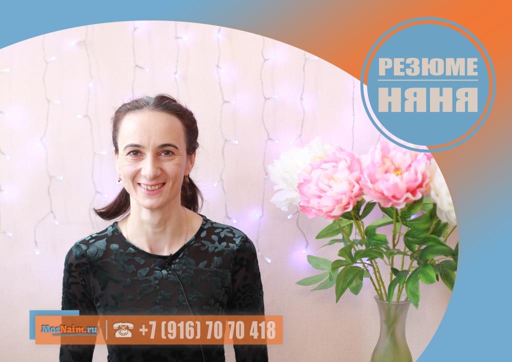 Имеет опыт работы: педагогический стаж (няня, воспитатель в детском саду) – 1 год; няня у одного ребёнка (мальчик 7 лет) – 3,5 года; няня у двойни (девочки по 5 лет) – 6 месяцев; няня у пятерых детей на частичную занятость (мальчики 4 года, 2 года, двойняшки по 0+ и девочка 0+) – 6 лет. Готова предоставить рекомендации.