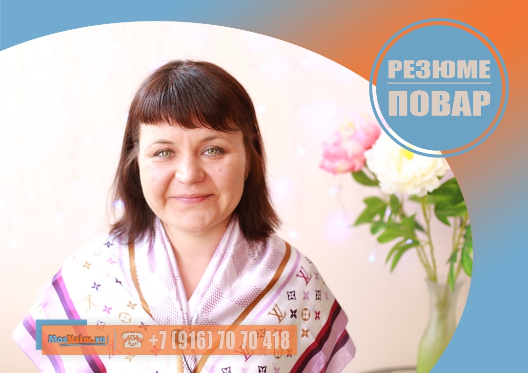 Имеет опыт работы: повар — 2 года; повар – 1 год; горничная с функциями повара (частичная занятость) — 6 месяцев.
